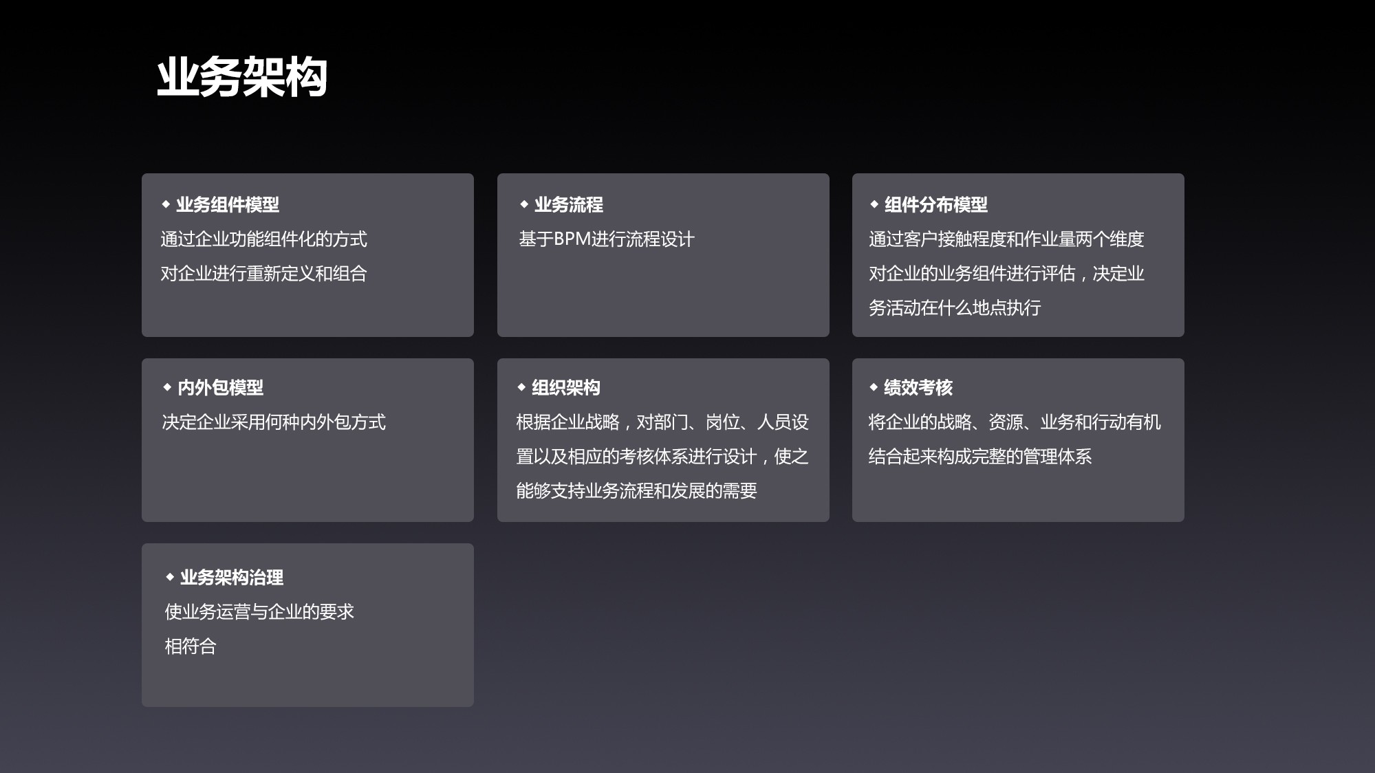 基于BPM設(shè)計(jì)業(yè)務(wù)流程,結(jié)合管理層ARC - ERP系統(tǒng)與“樞理”數(shù)據(jù)治理,梳理、優(yōu)化流程,消除冗余環(huán)節(jié),提升運(yùn)轉(zhuǎn)效率;借組件分布模型,從客戶接觸程度和作業(yè)量維度,評估業(yè)務(wù)組件,合理規(guī)劃業(yè)務(wù)活動執(zhí)行地點(diǎn),降低運(yùn)營成本;以內(nèi)外包模型,科學(xué)決策業(yè)務(wù)外包方式,聚焦核心競爭力;依據(jù)戰(zhàn)略設(shè)計(jì)組織架構(gòu),適配部門、崗位、人員及考核體系,為業(yè)務(wù)流程筑牢組織支撐;通過績效考核,串聯(lián)戰(zhàn)略、資源、業(yè)務(wù)與行動,構(gòu)建完整管理體系;依托業(yè)務(wù)架構(gòu)治理,確保業(yè)務(wù)運(yùn)營貼合企業(yè)要求,讓戰(zhàn)略落地“看得見、摸得著”。